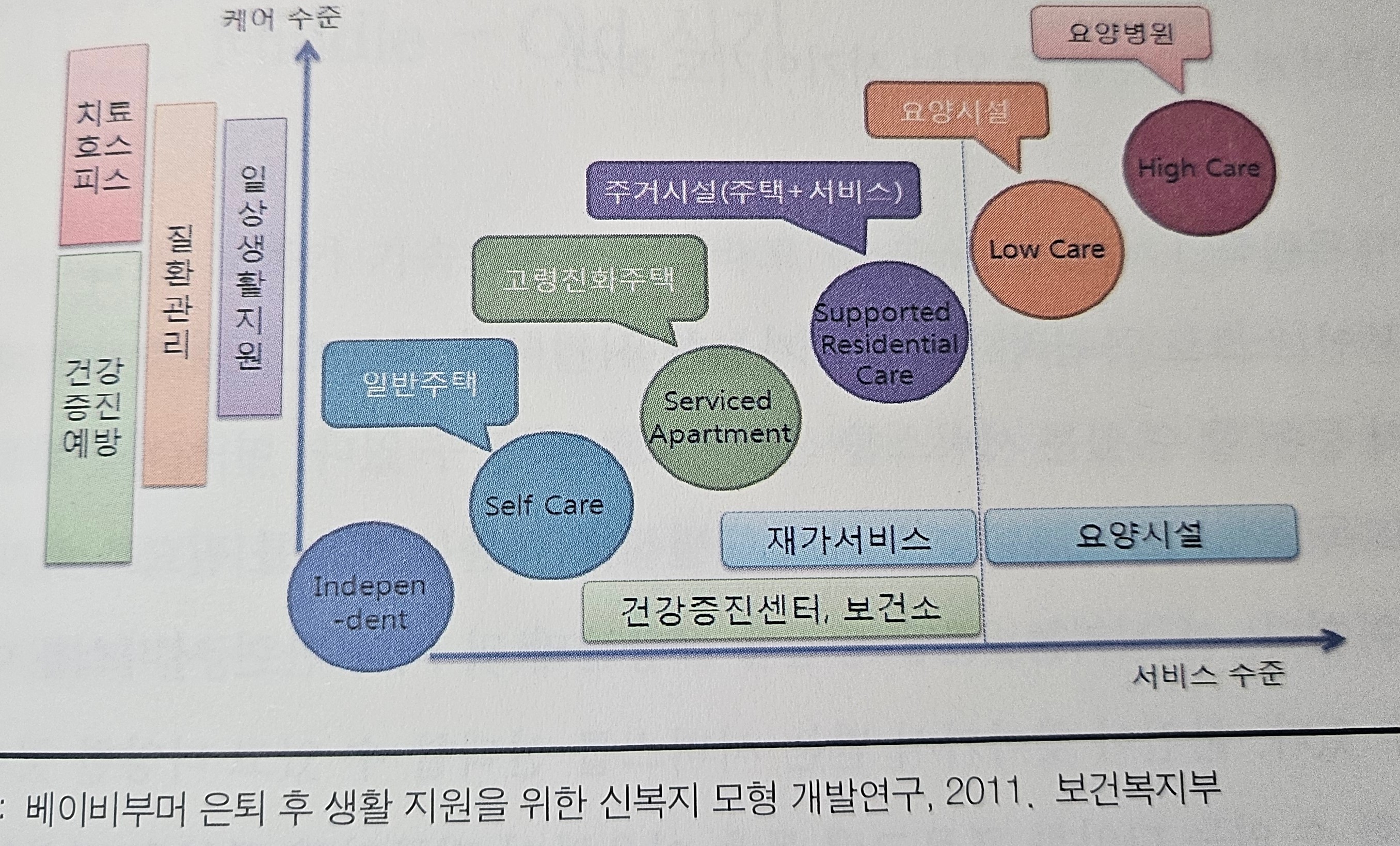 자료 에서 와 같이 생애주기를 기준으로, 거주하는 곳과 위의 3단계 시기를 합쳐보면 나이별 사는 곳과 기능저하 시기에 따라 필요한 것 들이 보이게 되고, 필요한 서비스를 연결 지어 보면 생애주기 기준과 생애 주기별로 거주 하는 곳을 기준으로 받을수 있는 서비스, 이용 할수있는 서비스를 나누어 볼수 있다. [실버산업전문가포럼의 시니어 비즈니스 스쿨: 저서: 황현숙대표 P266~P,269] "위와같이 다른 사람의 도움을 통해서 Care가 유지되는 시기에는 도움이나 서비스 시설에 입소하는 것에 대해 충분히 준비하고 계획을 세워야 된다" 고 (주)희원빌, 황현숙 대표는 포럼을 통하여 설명하고 있다.